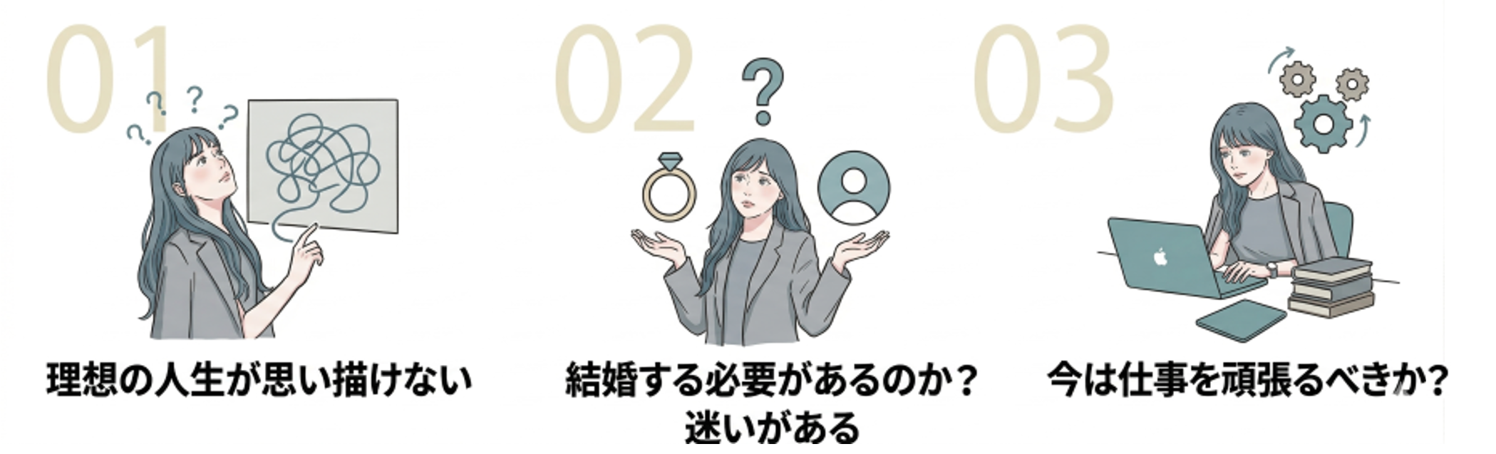 恋愛・結婚はもちろん、仕事や起業、副業といったキャリアの悩みまで一貫して支援。今の悩みを解決し、今後どの道を選ぶのが最善かをプロの視点で助言し、具体的な行動へと繋げます。人生の停滞を打ち破り、前へ進むための伴走者。それが、他の相談所にはない私たちの唯一無二の強みです。